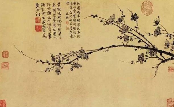有梅之记,始见于《西京杂记》汉初修上林苑,远方各献名果异树,有‘朱梅’、‘胭脂梅’。迄今2000年矣。 梅入画,有史载始于南北朝,至宋僧仲仁方盛,称“墨梅始祖”。 宋 赵佶 《腊梅山禽图》 绢本设色 纵82.8厘米 横52.8厘米 宋 扬无咎 《四梅花图》 “未开” “欲开” “盛开” “将残” 马麟《层叠冰绡图》 宋 林椿 《梅竹寒禽图》 宋 赵孟坚 《岁寒三友图》 吴镇《墨梅图》 王冕《梅花图》 文征明 《冰姿倩影图》 徐渭《梅花图》 陈洪绶《梅花山鸟图》 清 弘仁《梅花图》 八大山人《梅花图》 石涛《梅花图》 李方膺《梅花图》 齐白石梅花 潘天寿 梅花 ------------------------------- |