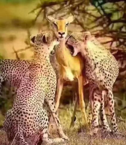 三只猎豹追一只母鹿和两个鹿宝宝,以母鹿的奔跑速度可以轻松逃掉这场杀戮。