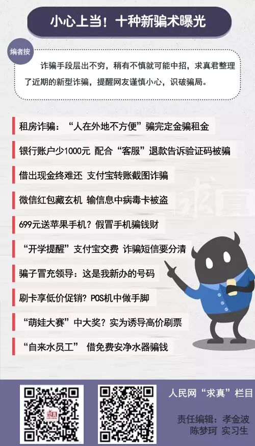 近期连续发生多起电信诈骗案,诈骗手段层出不穷,稍有不慎就可能中招,有记者整理了近期的新型诈骗,三步分解骗子惯用的伎俩,希望对读者有所帮助。 1、租房诈骗:“人在外地不方便”骗完定金骗租金 近期北京一位网友在网络上寻找出租房时联系到一位“房东”,该房东以“人在外地不方便”、“房源紧俏”等理由,要求其网络转账交易,骗取了定金、租金约4万元。 骗术分解 ① 精心设计好房源,在网络发布租房信息吸引求租者; ② “房东”出差人在外地,建议先交定金; ③ 以“邮寄或打车请人代交钥匙及房产证”为由继续骗取租金。 类似诈骗还有假房东交付“假钥匙”骗租金等,由于租客急于找房,警惕性降低,所以虽然过程有漏洞,但还是不少人上当。把握一点,就是没有凭证千万不要提前交任何钱。 2、银行账户少1000元 配合“客服”退款却被骗 据一网友反映,近日他收到银行扣款1000元的短信,随后“客服”打电话称他误买了游戏币,为了配合退款他就把收到的验证码告诉了对方,1000元真的被转走了。 骗术分解 ① 骗子入侵受骗者的网银,将资金转至卡内理财账户中,随后受骗者收到钱被转出的官方短信; ② 骗子冒充银行工作人员打电话表示可以按程序返还,并先操作网银返还小额资金至受害者银行卡,骗取信任; ③ 骗子称大额资金返还需要验证码,受骗者按要求告知后,大额资金就被转入骗子的账户。 银行卡莫名其妙消费被扣款,看到官方短信难免着急慌乱。如果发现银行账户内有不知名的扣款,一定要第一时间到银行柜台或者拨打银行官方客服电话核实,不要轻信所谓的客服人员,绝不能将验证码告诉对方! 3、借出现金终难还 支付宝转账要小心 山东市民张先生在火车站遇到一名“大学生”,他说不小心把钱包弄丢了,提出借现金用支付宝转账还钱。张先生取出700元现金给他,对方出示了一张支付宝截图,证明转账正在进行,虽没有及时到账但骗子谎称信号不好,因急着赶火车张先生就走了,而借出的钱却一直没到账。 骗术分解 ① 在人流量较大的车站、机场等地,骗子以钱包丢失为由向过往行人借现金,称用支付宝转账还钱; ② 向受骗者要账户,并且进行一个待转账的操作(并未输入密码,转账尚未成功); ③ 骗子将截图给受害者看让对方误以为已经转账,并以网络延迟为借口使行骗得手。 不法分子利用人们的热心与善心行骗。建议小伙伴们不要轻信转账截图,支付宝是即时到账,并不存在延时,应以自己账户实时收款为准。 4、微信红包藏玄机 输入信息卡被盗刷 李女士在某微信群抢了一个200元红包,但想领走现金,要在一网站上填写姓名、身份证号及领取礼金的银行卡号。输入信息后,她收到了短信验证码。在输入验证码后,李女士银行卡里的一万多元钱便不翼而飞。 骗术分解 ① 骗子进入微信群发送“伪装红包”,受骗者领取时进入网站页面; ② 通过钓鱼网站引诱用户填写个人信息及银行卡号; ③ 通过植入木马等手段,对用户的手机号码进行拦截,验证码直接发送到骗子手机上,银行卡就会被盗取。 领取奥运庆功的红包,领取“500元代金券”?面对诱惑请慎重!切记真正的微信红包接收的时候,是绝对不需要输入姓名、银行卡号、密码等信息的。 5、骗子冒充领导:这是我新办的号码 市民于女士突然收到领导发来的换号短信,她顺手就存下来了,不久后“领导”告知:转钱给某个银行账号,于女士按照要求汇款操作,就这样被骗走了7000元。