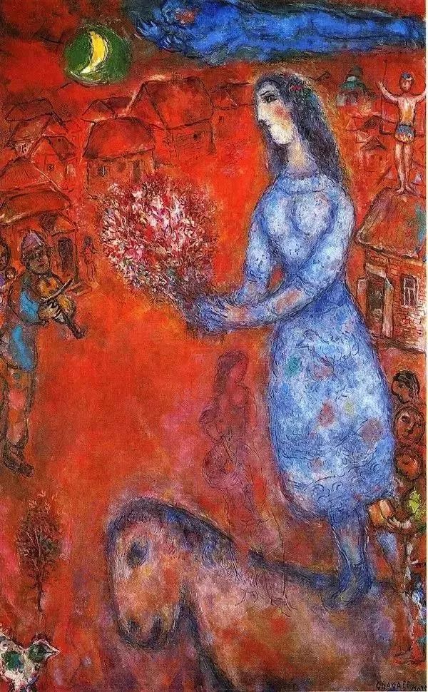 《捧花的未婚妻》(1977) 夏加尔对能自己能娶到贝拉感到庆幸之至。虽然都是犹太人,夏加尔出身乡下的穷苦人家,而贝拉则来自富裕的犹太珠宝商家庭。贝拉十四岁那年,两人初见,“她的沉默是我的,她的眼睛是我的,她懂我的过去,现在和未来。”夏加尔写道。一段长达35年的爱情就此拉开序幕。