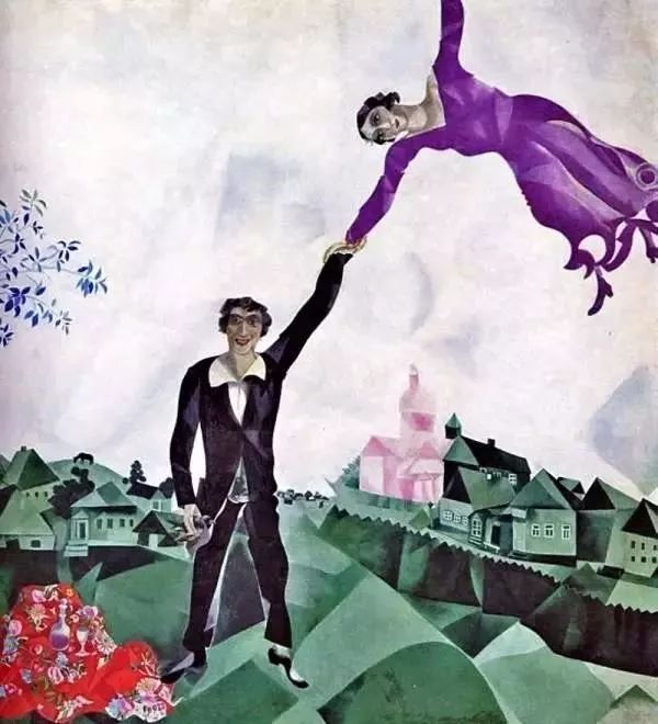 《小镇之上》(1918) 他对贝拉说:“只要一打开窗,她就出现在这儿,带来了碧空、爱情与鲜花。从古老的时候起直至今日,她都穿一身白衣白裙或者黑衣黑裙,翱翔于我的画中,照亮我的艺术道路。” 《生日》(1915) 《生日》(1915)或许是夏加尔最为人所知的一幅作品。画作描绘了夏加尔生日那天,妻子贝拉手捧鲜花为他庆祝的场景,画面上的二人幸福地飘在空中,夏加尔扭过头去献给妻子热烈的一吻。在夏加尔自传《我的生活》和贝拉散文集《点燃之光》中,都以各自视角讲述了这幅画背后的故事。