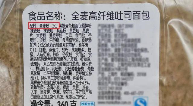 看着像全麦面包,其实是额外添加糖浆,焦糖色素,让面包呈现淡褐色,让面包看起来像是全麦制的,而且因为麸皮纤维多,口感较硬,接受的人群相对比较少。 为了改善这些口感,很多面包会添加品质改良剂,添加物等软化面包,很多人选择全麦面包为的是要吃的更健康才会选择全麦面包,但是无意识的摄入了很多额外的化学添加剂,可谓是得不偿失。 真正的全麦面包:没有小麦粉,必须是100%全麦。且配料表中第一位是全麦粉,其次是水和其它的。