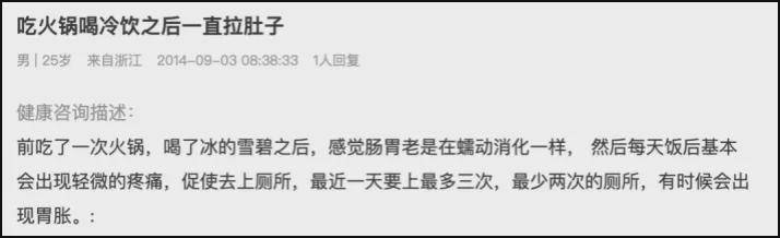 类似在网络上,一位25岁的年轻人就写道,自己之前吃了火锅,也喝了冰饮料,之后总是轻微腹痛,最近一天要去三次厕所。