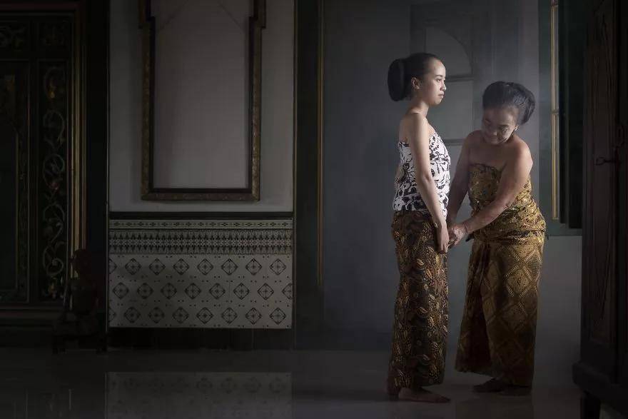 爪哇族的一位母亲和她的女儿 正在准备传统的舞蹈仪式 爪哇人对王族、身居高位的官绅及长辈非常敬重 在上司面前毕恭毕敬 在父母生日或者结婚纪念日 儿女要向父母跪拜 爪哇人的家庭大多数是一夫一妻制的小家庭 男女青年的婚姻大部分是自由恋爱 爪哇人喜欢皮影戏、舞蹈和音乐 文化修养一般比较高