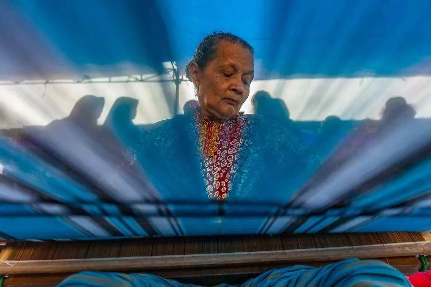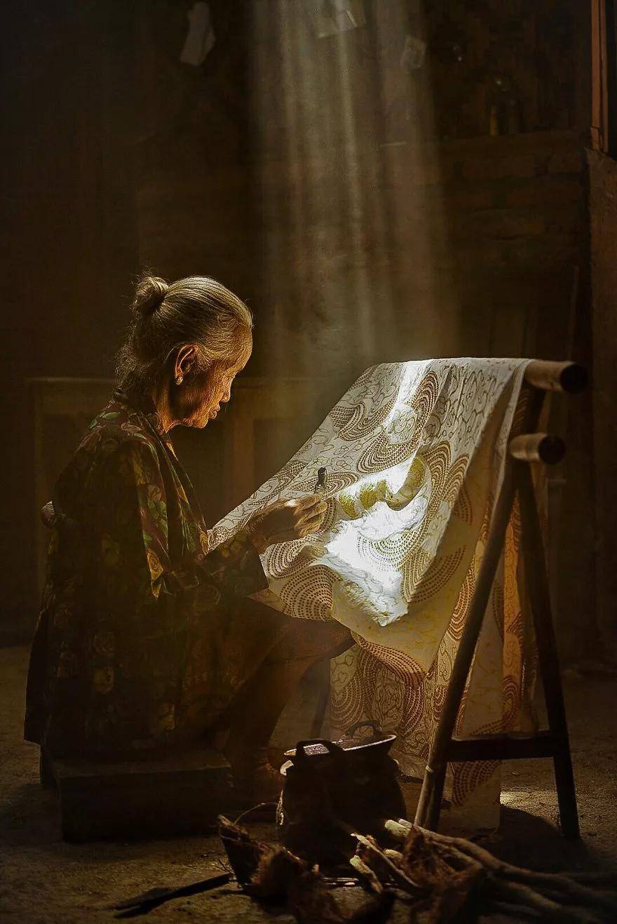 ▽ 阳光直射天花板 这位女士完成了蜡染画 这是印度尼西亚最古老的工艺之一