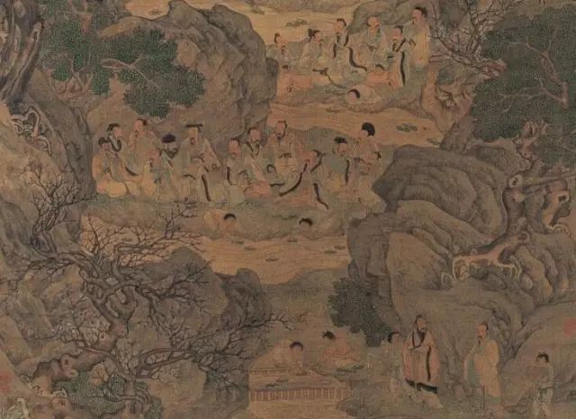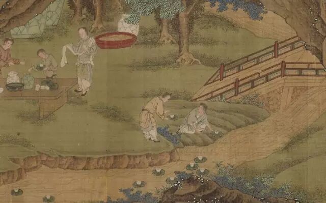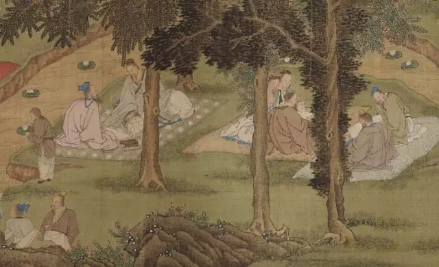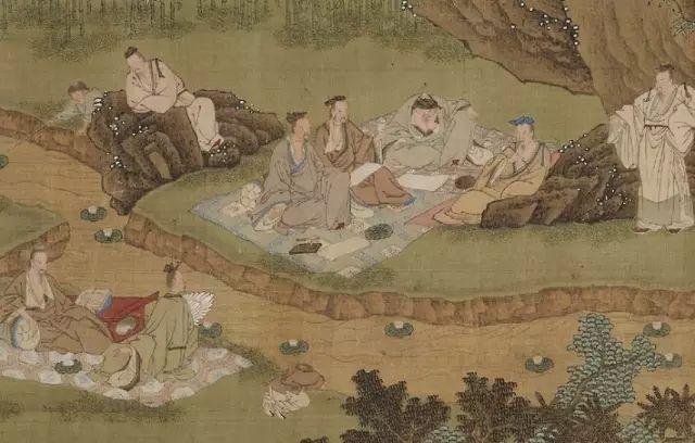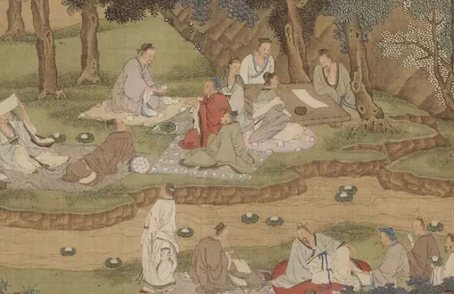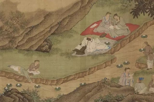 为了活跃气氛 有人想出了流觞曲水的玩法儿。 大家散坐在蜿蜒曲折的溪水两旁, 然后由书僮将斟酒的羽觞 放入澄澈的溪中,让其顺流而下, 若觞在谁的面前停滞了, 谁得赋诗,若吟不出诗, 则要罚酒三杯。