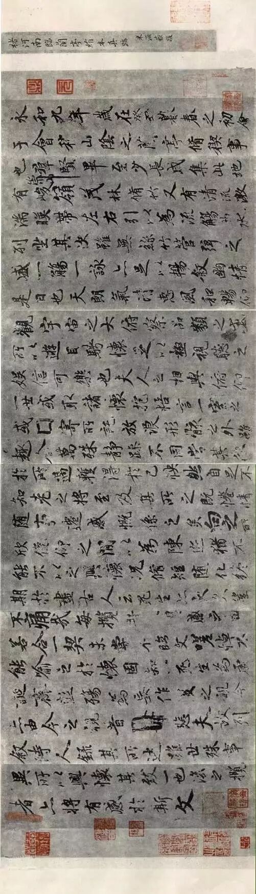 ▲《冯本》为唐代内府栩书官冯承素摹写,因其卷引首处钤有“神龙”二字的左半小印,后世又称其为“神龙本”,因使用“双钩”摹法,为唐人摹本中最接近兰亭真迹者。 最能体现兰亭风骨的摹本: (以下为定武本《兰亭序》长卷,请读者将手机横过来看。)