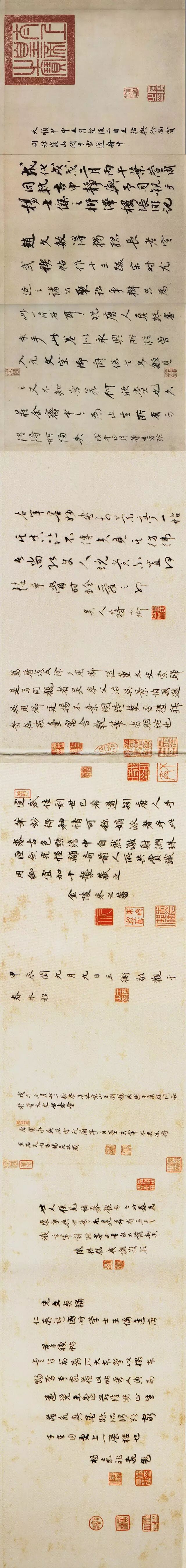 ▲《虞本》为唐代大书法家虞世南所临,因卷中有元天历内府藏印,亦称“天历本”。虞世南得智永真传,直接魏晋风韵,与王羲之书法意韵极为接近,用笔浑厚,点画沉遂。 最能体现兰亭魂魄的摹本: (以下为褚本《兰亭序》长卷,请读者将手机横过来看。)