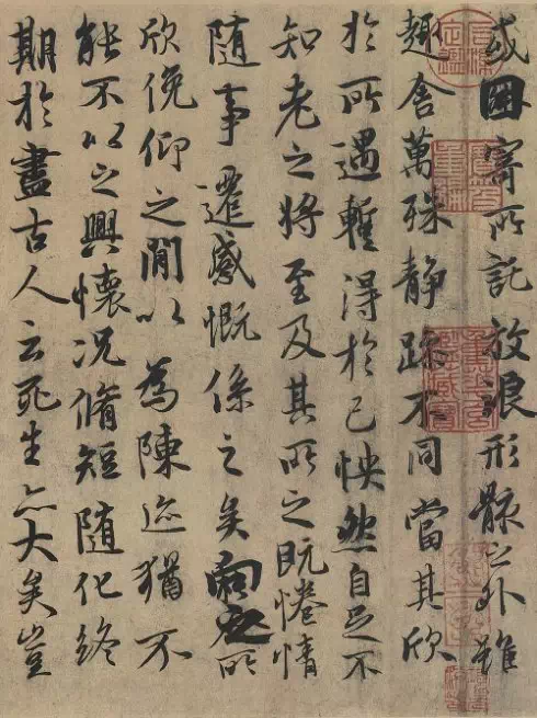 在《兰亭序》开篇, 我们读到的尽是美好愉悦 天也清朗,风也和畅, 宇宙是那么大,万物是如此盛, ,, , P ,> 眼前的一切都是如此美好。 这份舒畅的心情是 在丧乱年代长大的王羲之, 很少能拥有的,所以倍感珍惜的。 而到了《兰亭序》后半段, 羲之再也抑制不住心中的那抹忧愁 他说: 人与人相交往,很快便度过一生。 每当看到古人对死生发生感慨的原因, 和我所感慨的像符契那样相合, 没有不面对他们的文章而感叹悲伤的, 不能明白于心,本来就知道, 那种把死和生等同起来的说法是不真实的, 把长命和短命等同起来的说法是妄造的。 后代的人看现在, 也正如同我们今天看过去一样, 这真是可悲呀!