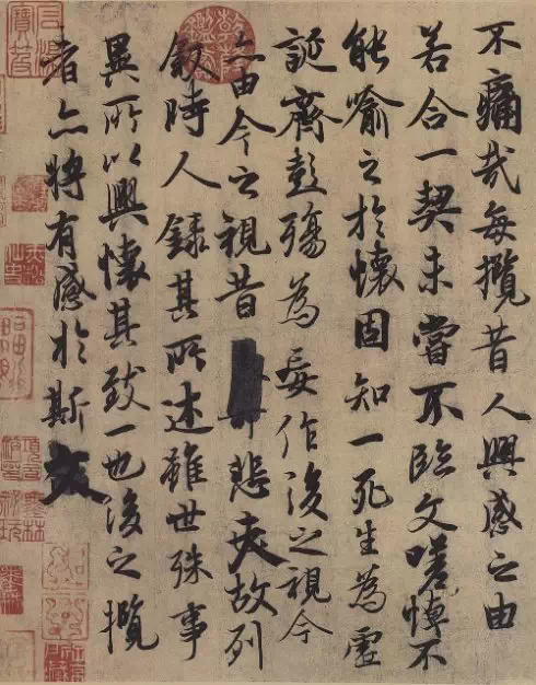 10.“岂不痛哉”。“痛”字覆盖的有点像是“它”字。 11.“每揽”。有书说,“'每’字中画浓墨,其余淡墨,显然记录了其由'一’字改写的过程。”其实,北魏张猛龙碑上的“每”字一横,也是粗大的。而且,冯承素摹写时,随时可以蘸墨。 12.“未甞不临文嗟悼”。 “甞”是“尝”的异体字,今已不用。 13.“后之视今亦由今之视昔”。 “由”,后人已纠正为“犹”,当“如同”讲。 14.“■■悲夫”。 重墨抹去的字,一说是“良可”,但更可能是“足可”,还可能是“是可”、“亦可”。“夫”字,看出是盖住了“也”字。 15.“有感于斯文”。神龙本的“文”字,特别模糊。唐.褚遂良的临本,一眼就看出是由“作”字改写。